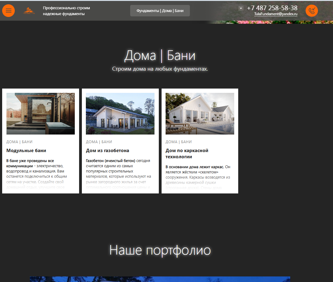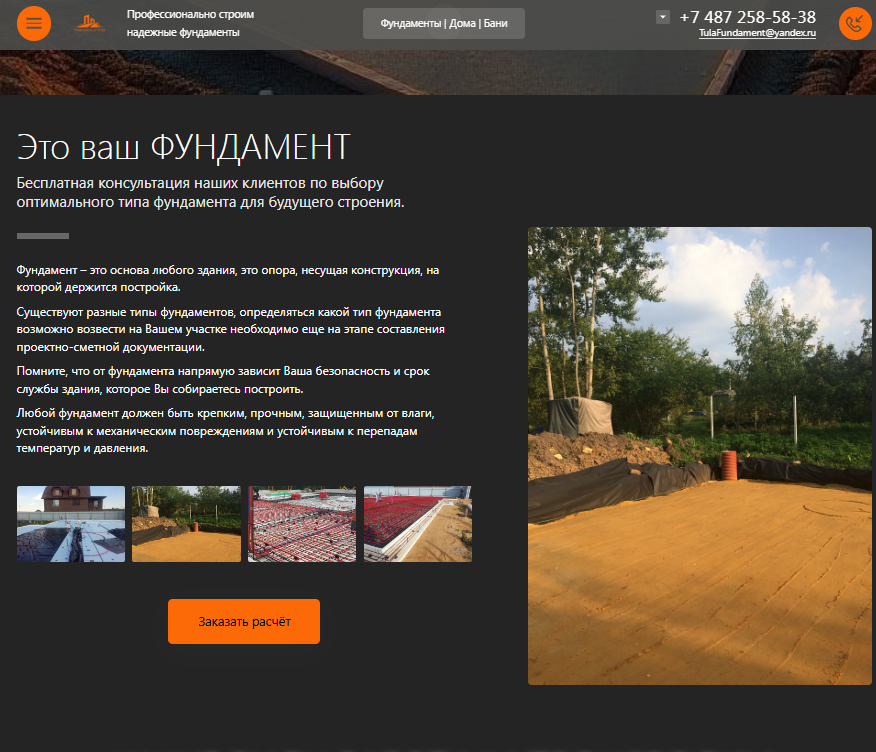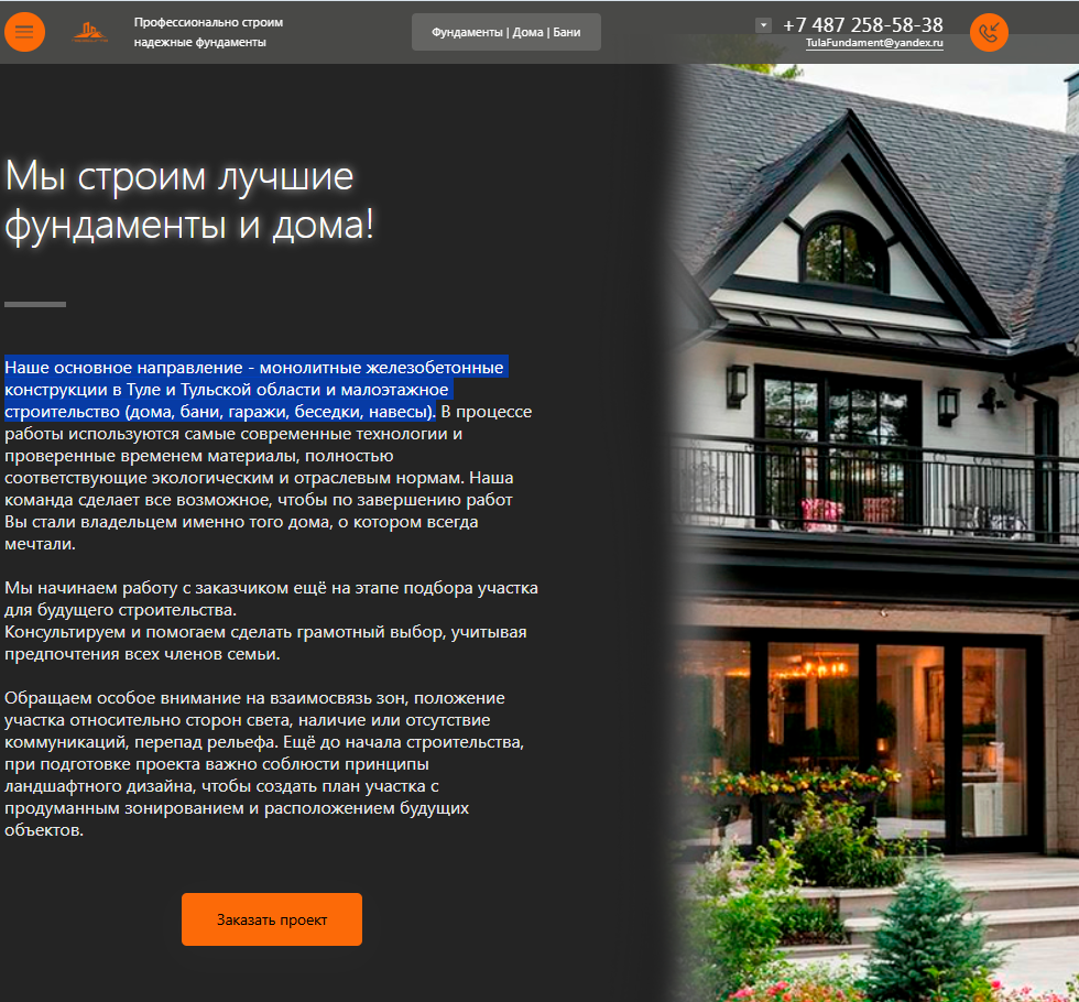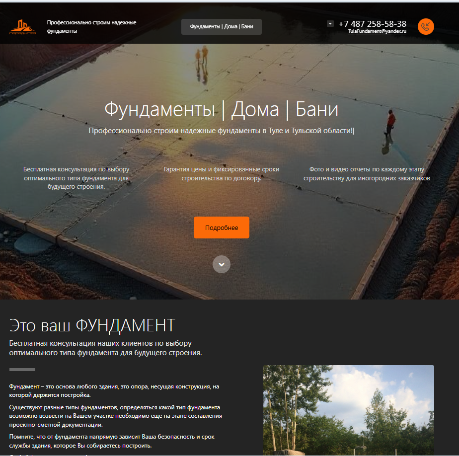 Одностраничный сайт для "Строительство фундаментов, каркасных домов и модульных бань под ключ в Туле"