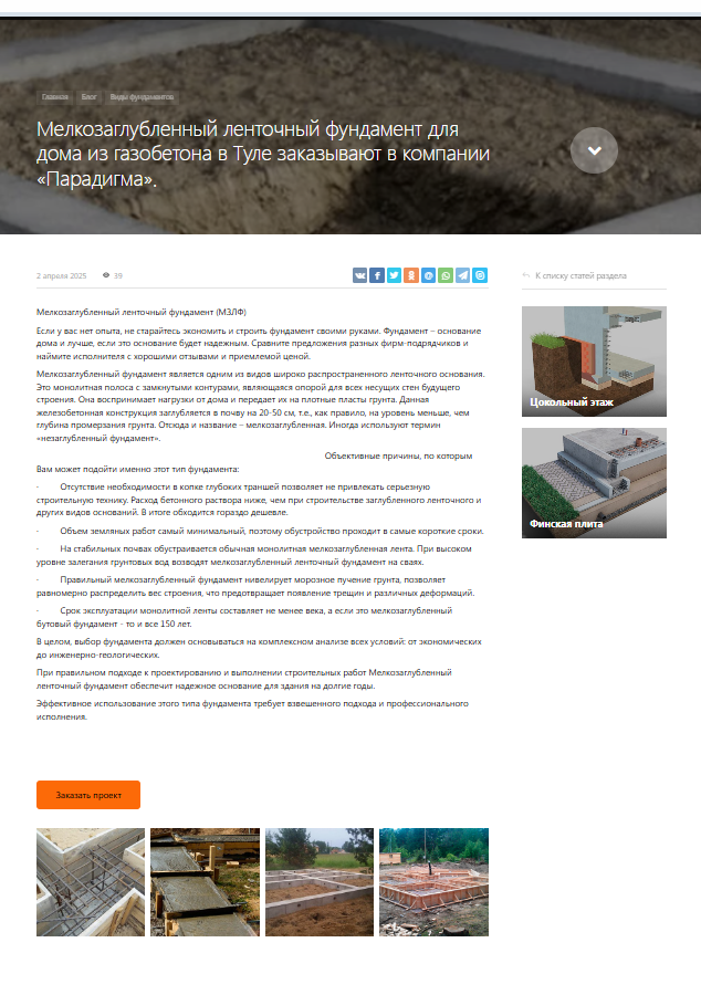 Разработка сайта для компании "Парадигма- Строительство фундаментов, каркасных домов и модульных бань под ключ в Туле"